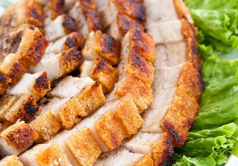 Slow-roasted, skin-on pork belly...